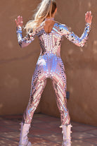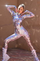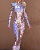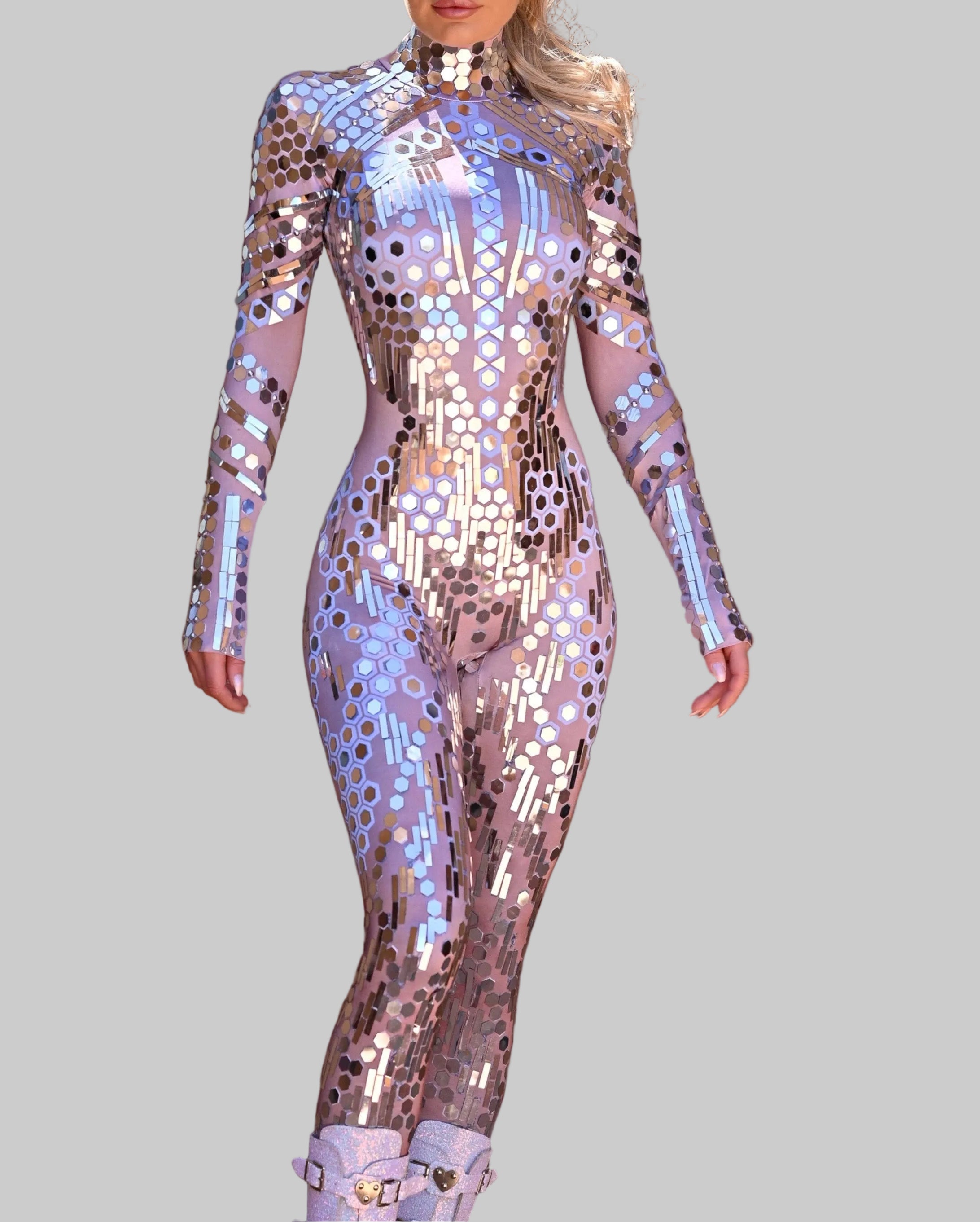 This full-length bodysuit features a high neckline and long fitted sleeves. The surface is covered with reflective geometric sequin embellishments arranged in varied shapes. Sheer mesh panels are visible beneath the sequin layout across the torso and legs. The design extends to ankle length with a close-fitting silhouette.