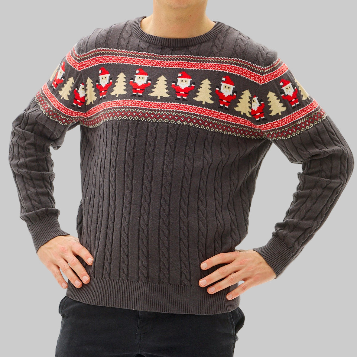 This sweater features a repeated festive motif across the chest and upper sleeves, including geometric shapes and character-themed elements. The body displays a visible cable-knit texture running vertically from top to bottom. Ribbed cuffs, a ribbed hem, and a ribbed crew neckline are present.