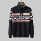 This sweater features a visible half-zip closure at the neckline and a high ribbed collar. The upper section displays a repeated geometric and animal-themed pattern across the chest and sleeves. Ribbed cuffs and a ribbed hem are present at the edges.