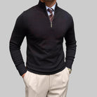 This jumper features a half-zip closure positioned at the front neckline. It has a stand collar that extends upward when zipped. The sleeves and hem include ribbed finishes, and the knit surface appears uniform throughout.