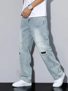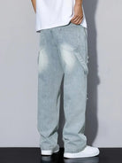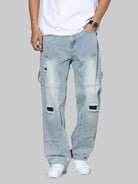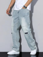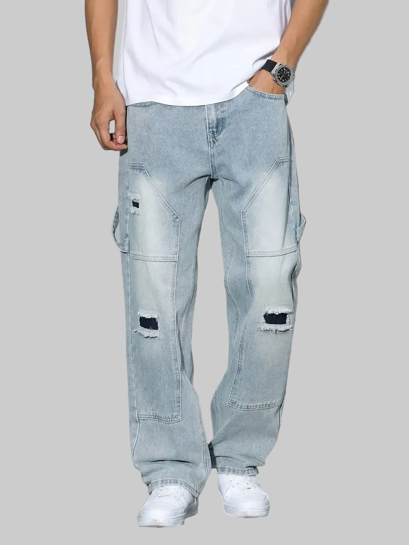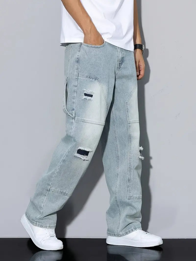 These men's pants are made from a wash denim with a faded finish. The pants feature a wide-leg cut. Visible patches in a darker shade are applied to the pants, and there are torn sections located at the knees. The back of the pants includes standard pockets.