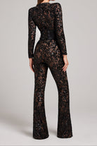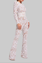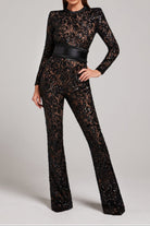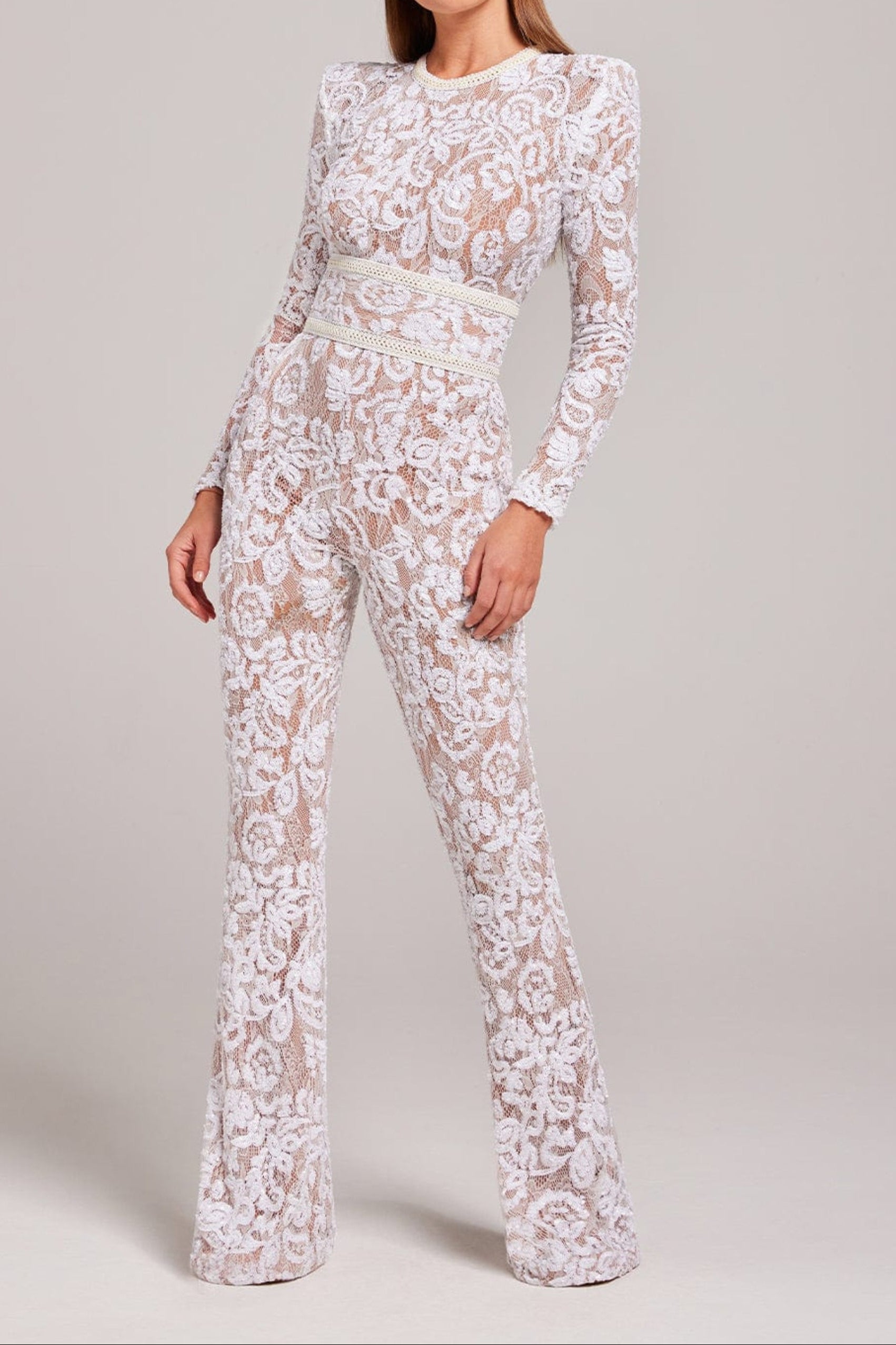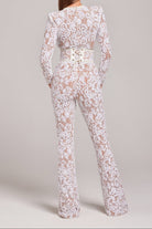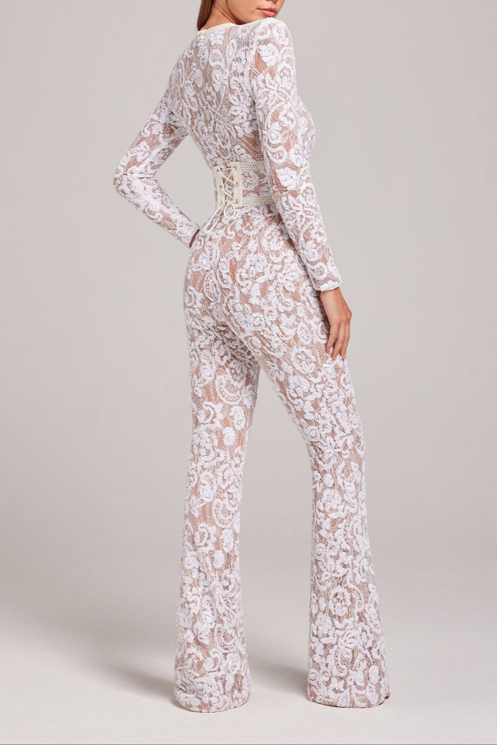 This jumpsuit features a long-sleeve design with an all-over lace pattern. The fabric is sheer, showing a transparent appearance across the body and legs. A wide waistband with structured paneling is positioned at the midsection, and the back includes a lace-up fastening detail. The legs extend to a full length with a slightly flared shape.