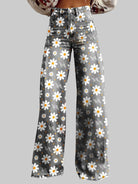 These jeans feature a wide-leg, full-length design with a relaxed silhouette. The exterior displays an all-over floral print made up of repeated flower shapes. A classic five-pocket layout is included on the front and back. The waistband has belt loops, a front button, and a zipper fly closure.