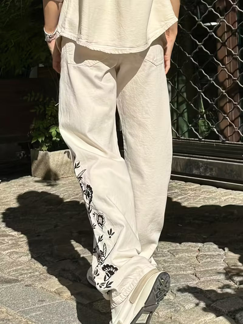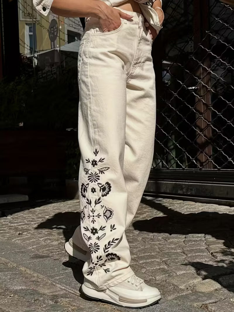 - Embroidery: Floral embroidery runs down both sides from mid-thigh to ankle.