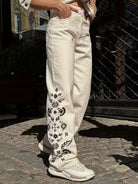 These women’s pants feature a wide fit through the legs and a high waist with belt loops. They include a button closure at the center front. The pants feature both front and back pockets. Embroidery featuring a floral pattern runs down the sides of both pant legs, extending from mid-thigh to the ankle.