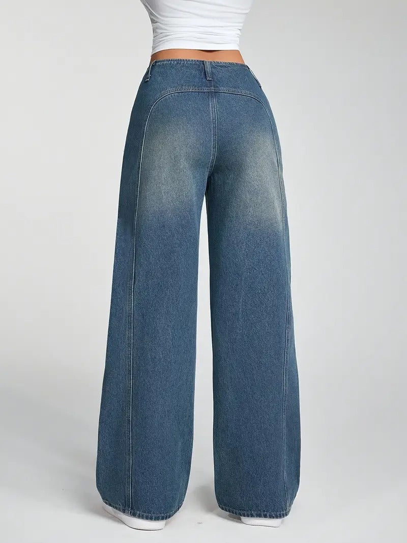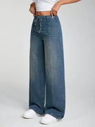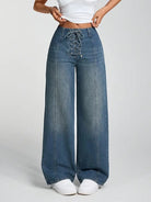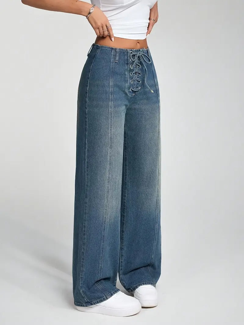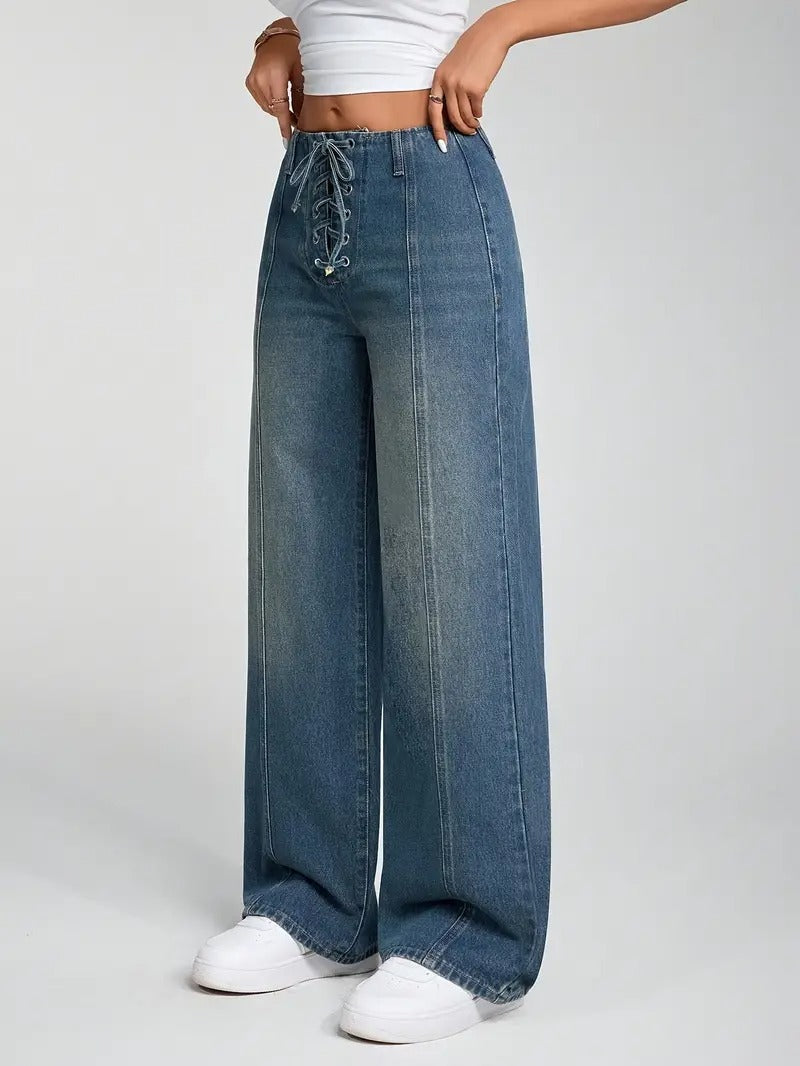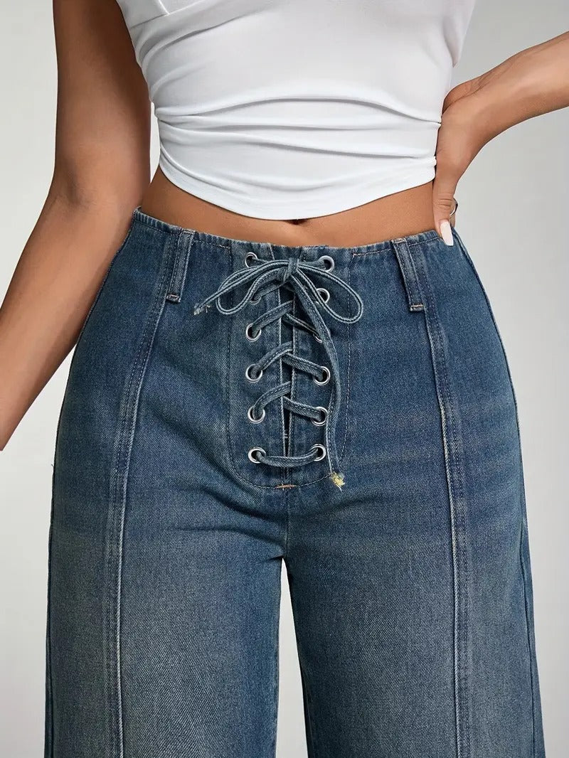 These women’s jeans feature a high-waisted fit and feature a lace-up front, with laces threaded through metal eyelets to cinch the waist. Belt loops are also included at the waistband for an additional styling option. The wide-leg cut runs straight through to a full length that reaches the ankles.